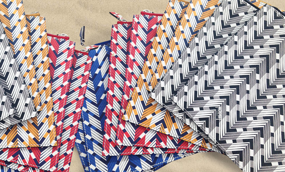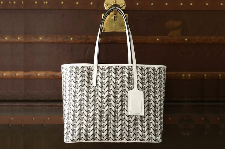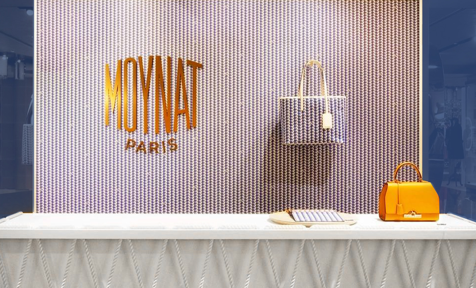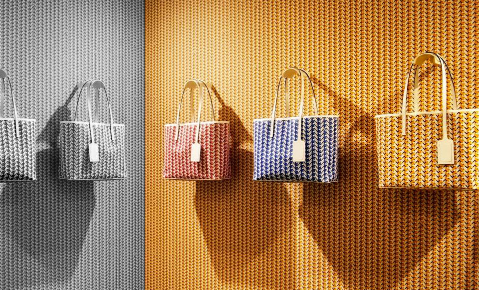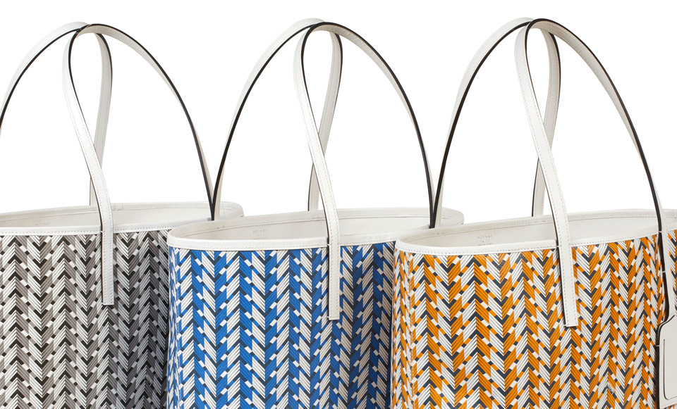 Rivage collection for LVMH's High Maroquinerie brand Moynat, silkscreened on sustainable calfskin leather, composed of a tote bag and carry-on pochette, in 4 shades of blue, yellow, black and a special red edition for Isetan Tokyo